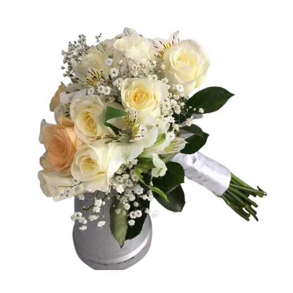 Ramo redondo con rosas color salmon, rosas color crema, alstroemeria blanca y paniculata