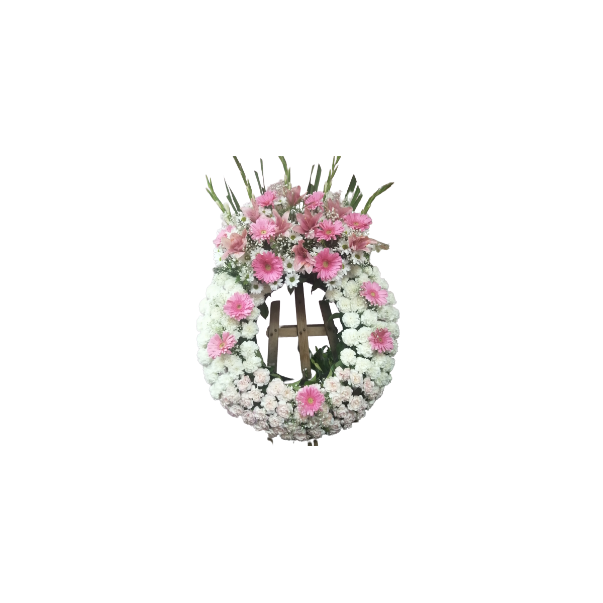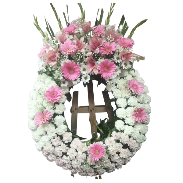 Corona de claveles, gladiolos, margaritas y gerberas
