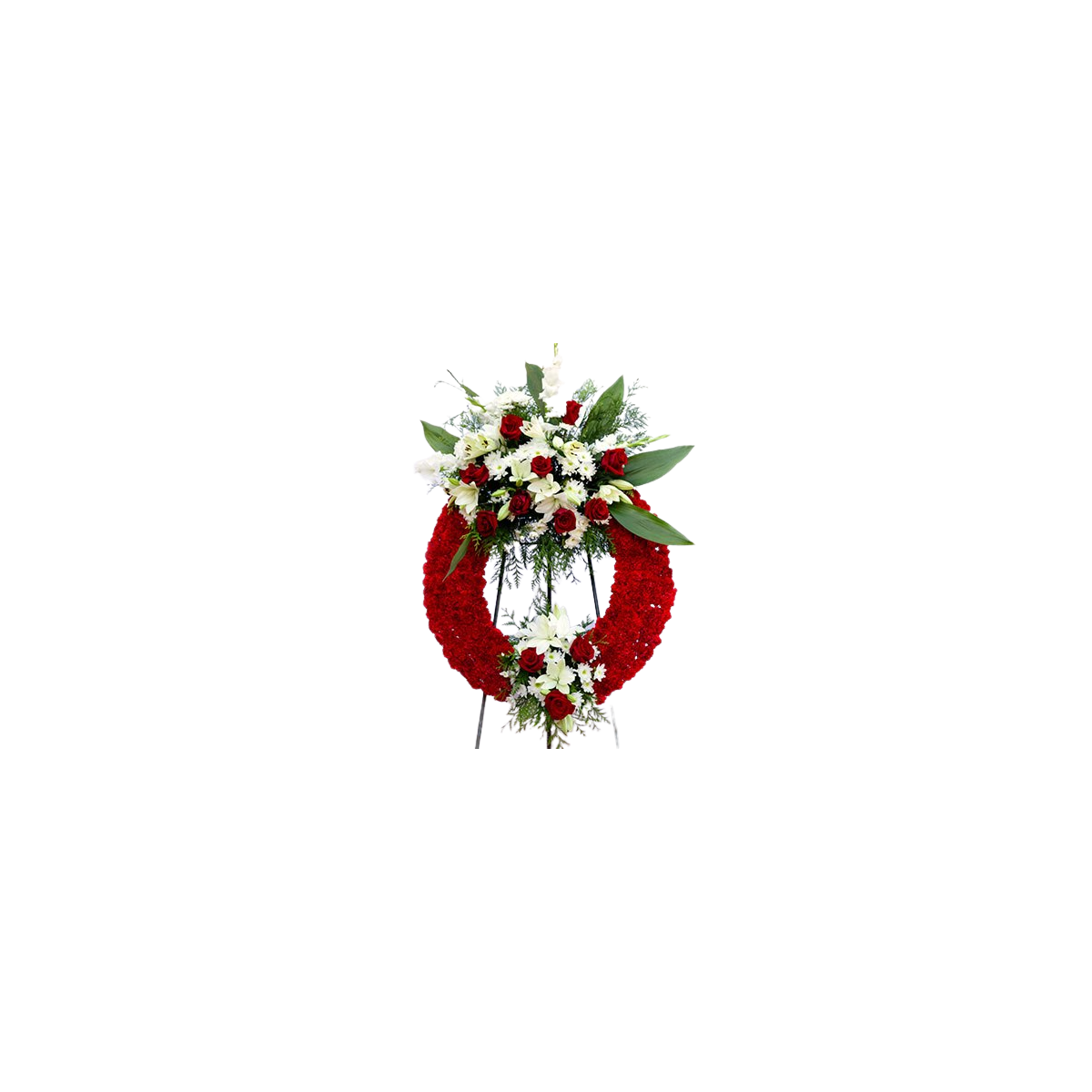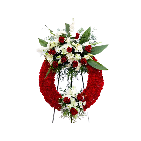 corona para difunto blanca y roja con dos cabezeros.