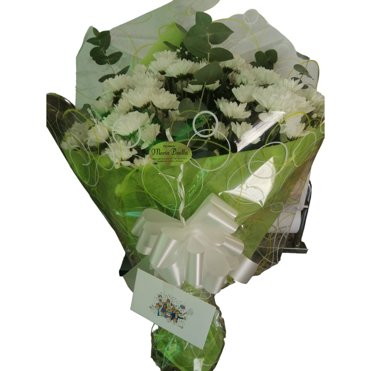 Ramo de margaritas blancas con adorno floral.